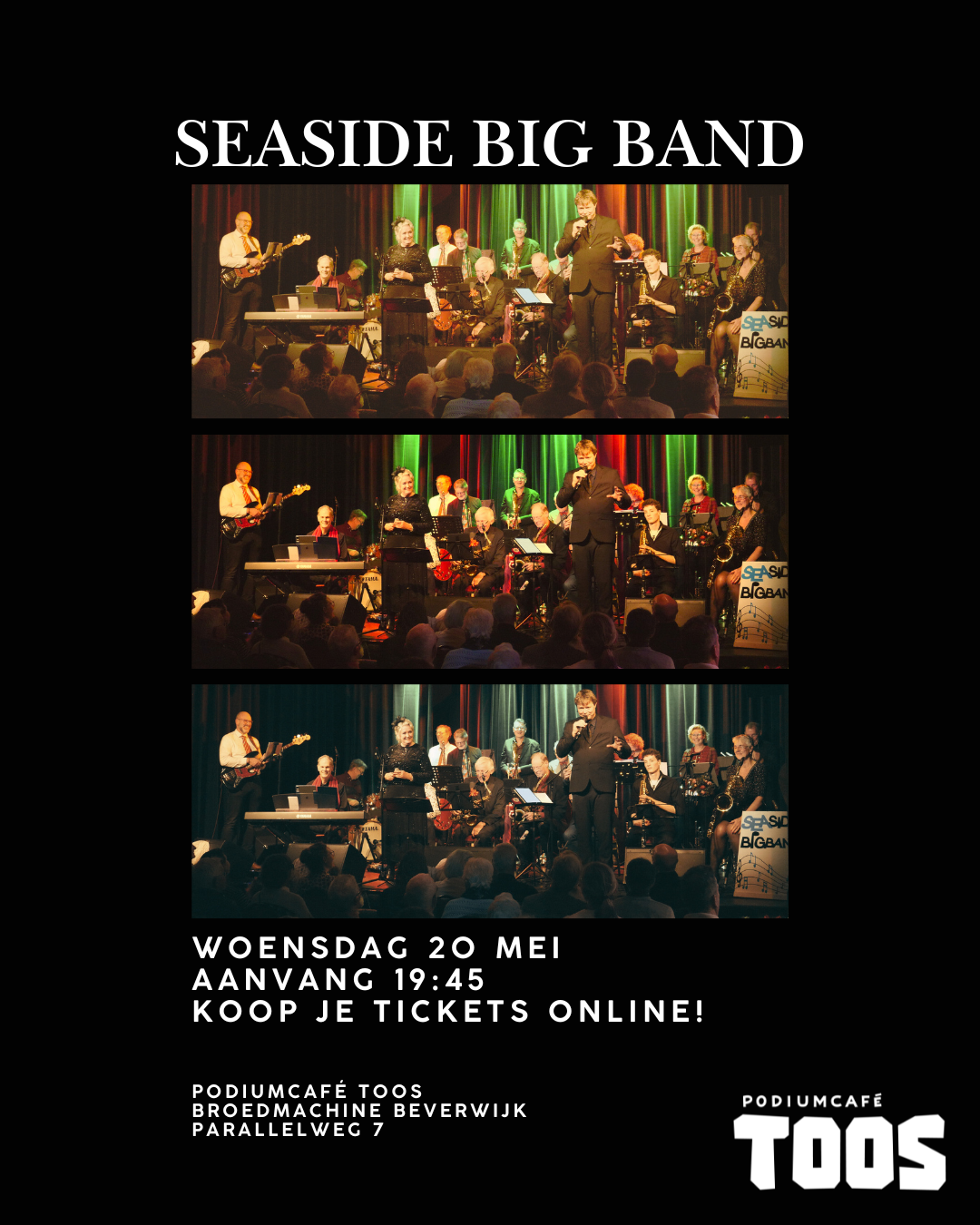 Woensdag 20 mei is het zover: de allereerste keer dat de Seaside Big Band ons podium overneemt! 🎷🔥